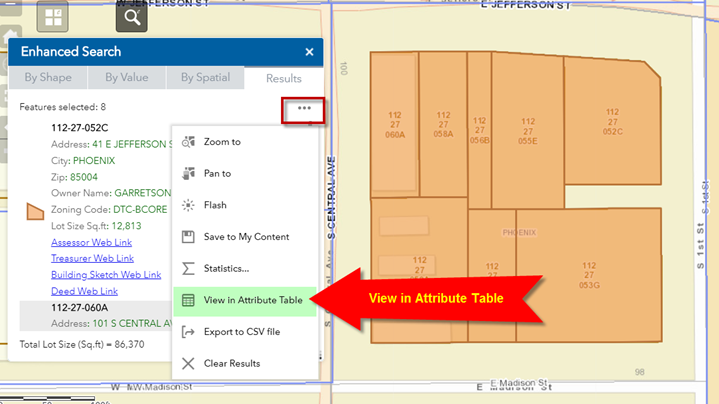 The attributes of these 8 parcels are displayed in the Attribute Table.