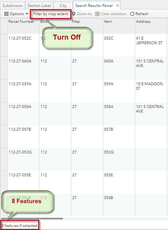 To see the complete listing of all the 8 selected parcels, turn off Filter by map extent.