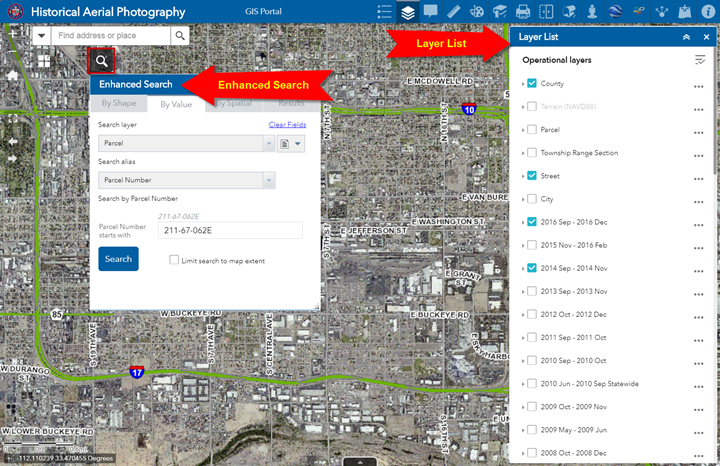 The Web App opens the Enhanced Search Widget and the Layer List Widget upon startup.