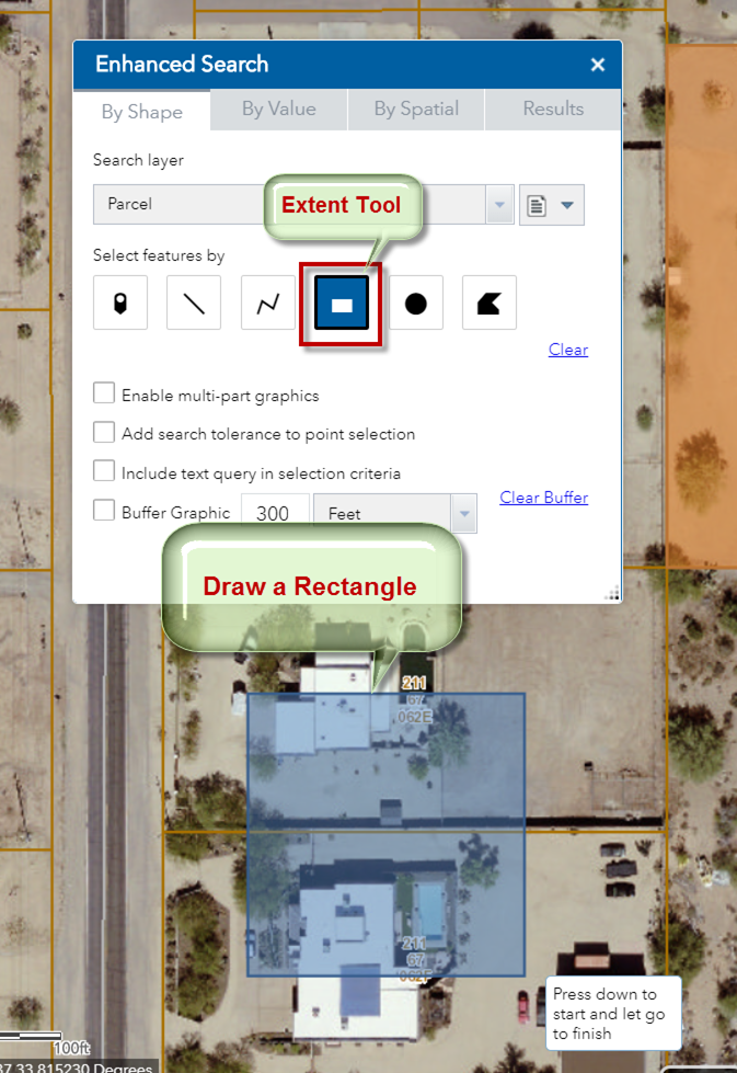 With the Extent Tool active, draw a rectangle on the map to intersect two parcels.
