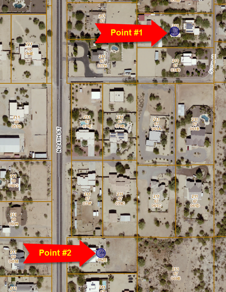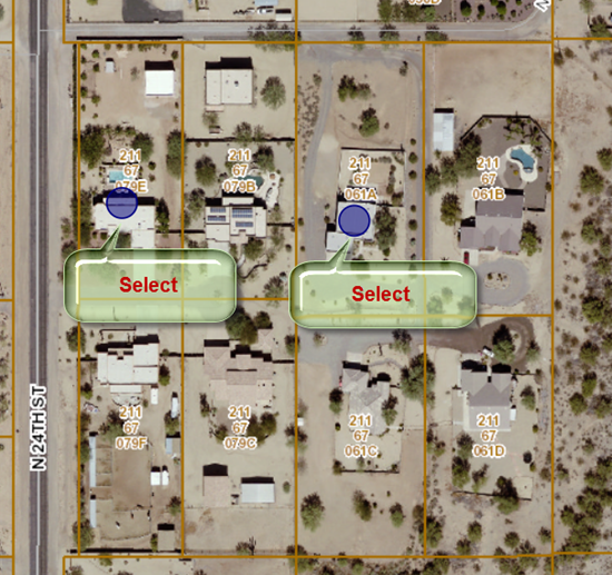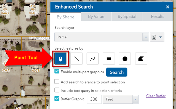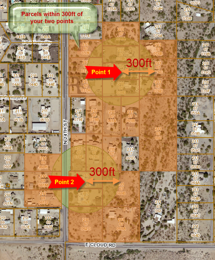 You may also drop one or more points on the map and select all the parcels that fall within a given radius of these points.