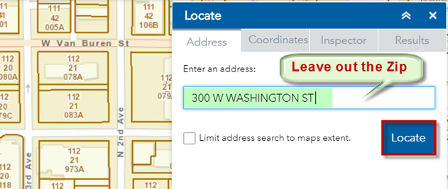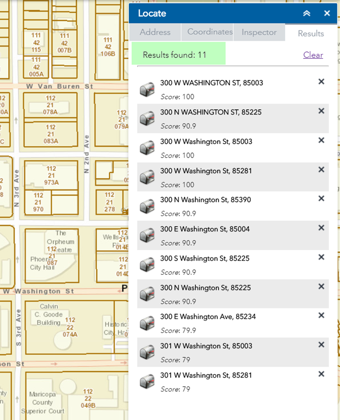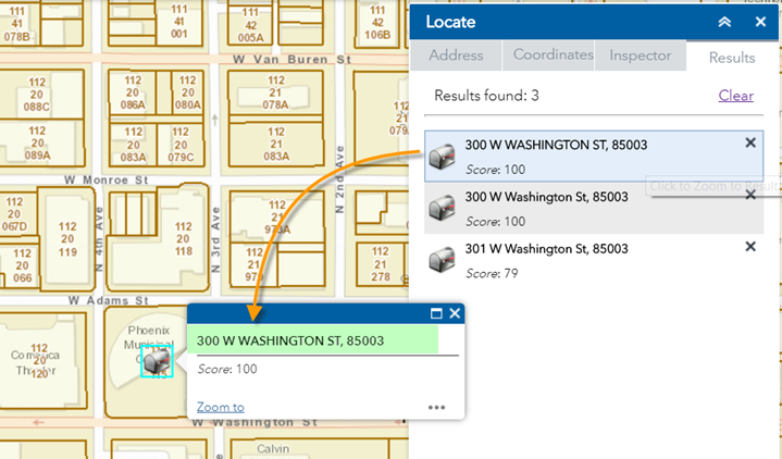 The map zooms to the Address = 300 W WASHINGTON ST 85003