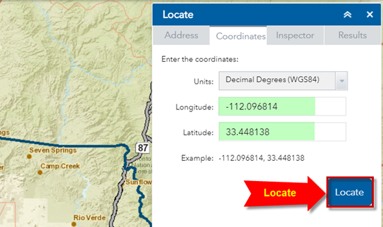 You can locate a point by entering the Latitude/Longitude values in Decimals Degrees in the WGS 1984 Datum.