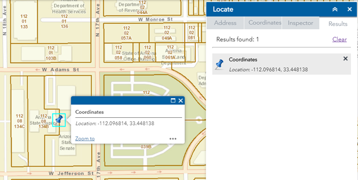 The map zooms to the Arizona State Capitol building.