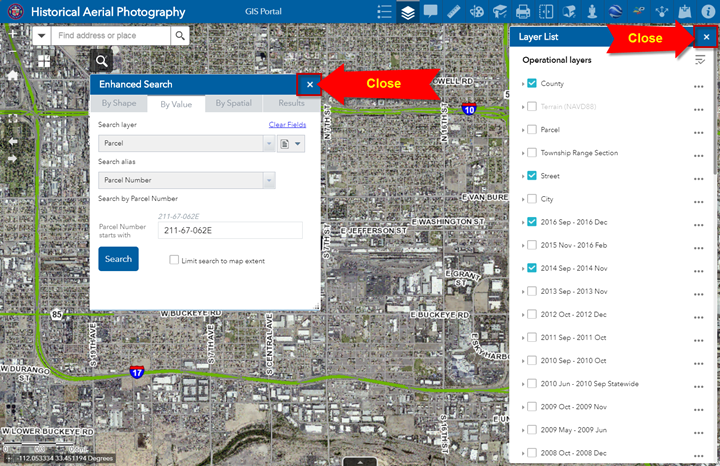 Clear up the display area by closing the Enhanced Search Widget and the Layer List Widget.