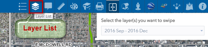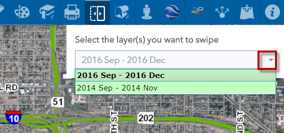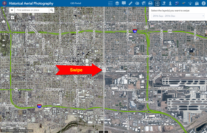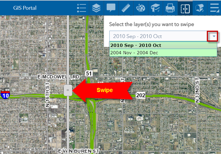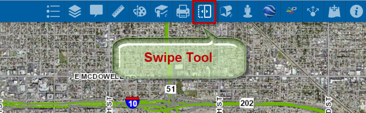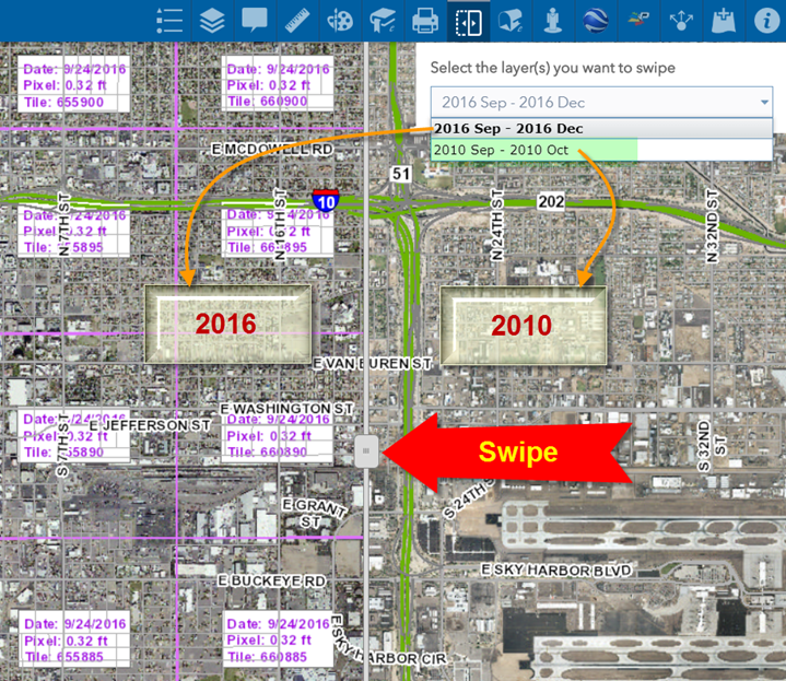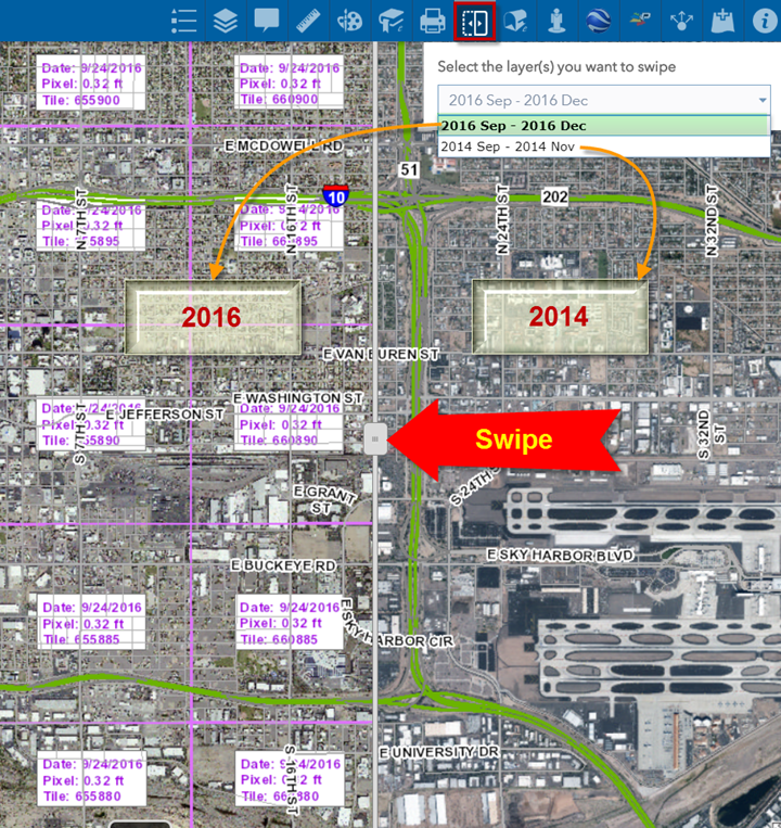 The Swipe Tool allows you to compare between any two aerial images with a horizontal swiping action.