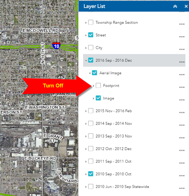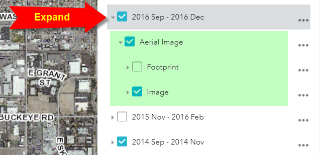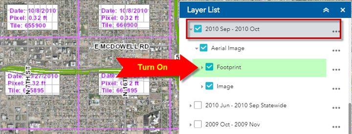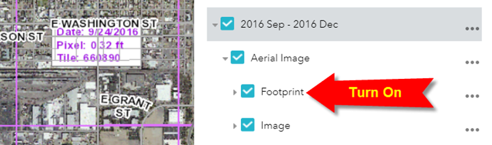 To view the Date Stamp of an imagery layer, turn on its corresponding Footprint Layer.